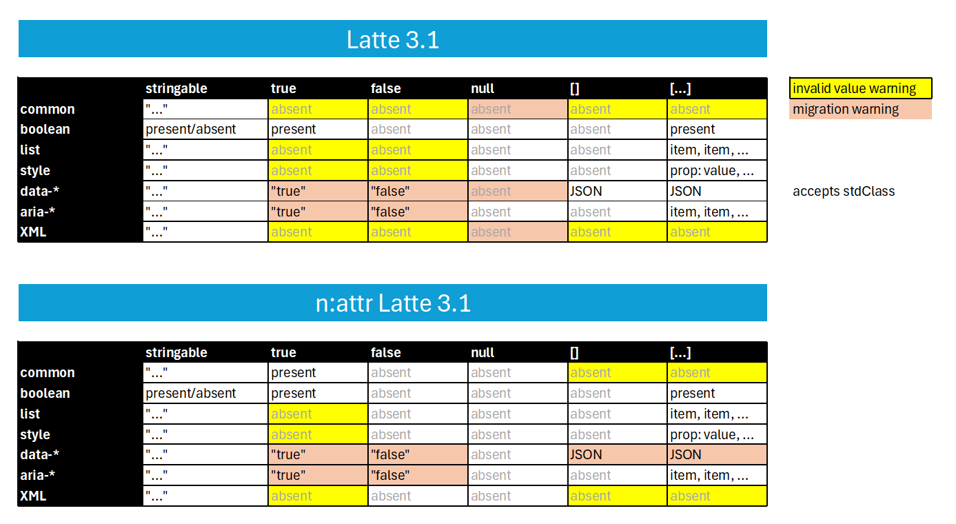 href,id,value,placeholder…) expect a value that can be rendered as text. This includes strings, numbers, or stringable objects.nullis also accepted (it drops the attribute). However, if you accidentally pass an array, boolean or a generic object, Latte triggers a warning and intelligently ignores the invalid value. - Boolean attributes (like